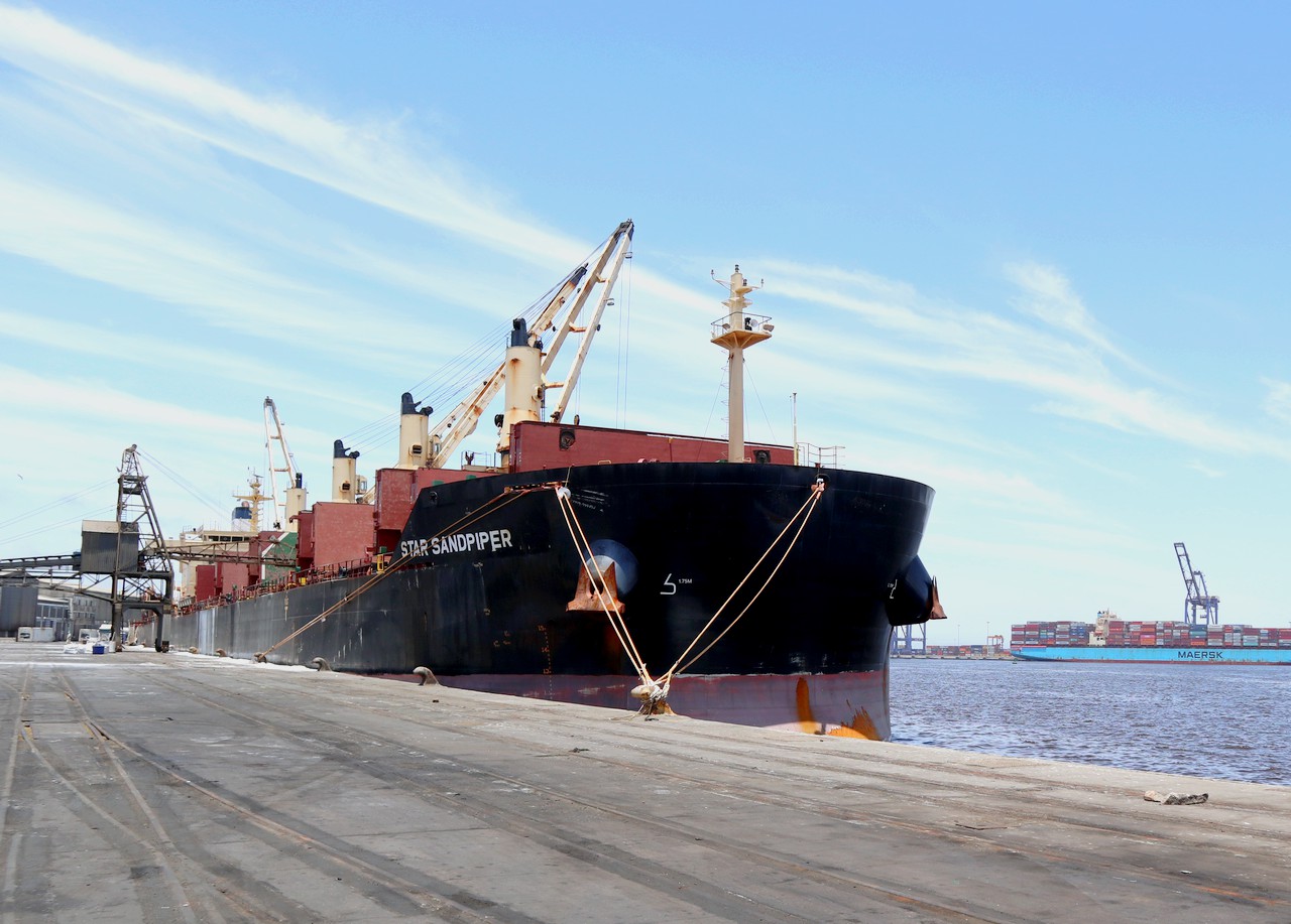To avoid contamination, the salt destined for bulk exports is transported from the bulk storage facility at the harbour by a conveyor belt and spout-trimmed into the ship's hold at the Walvis Bay dockside. Loading can take place on a 24-hour basis, seven days a week.