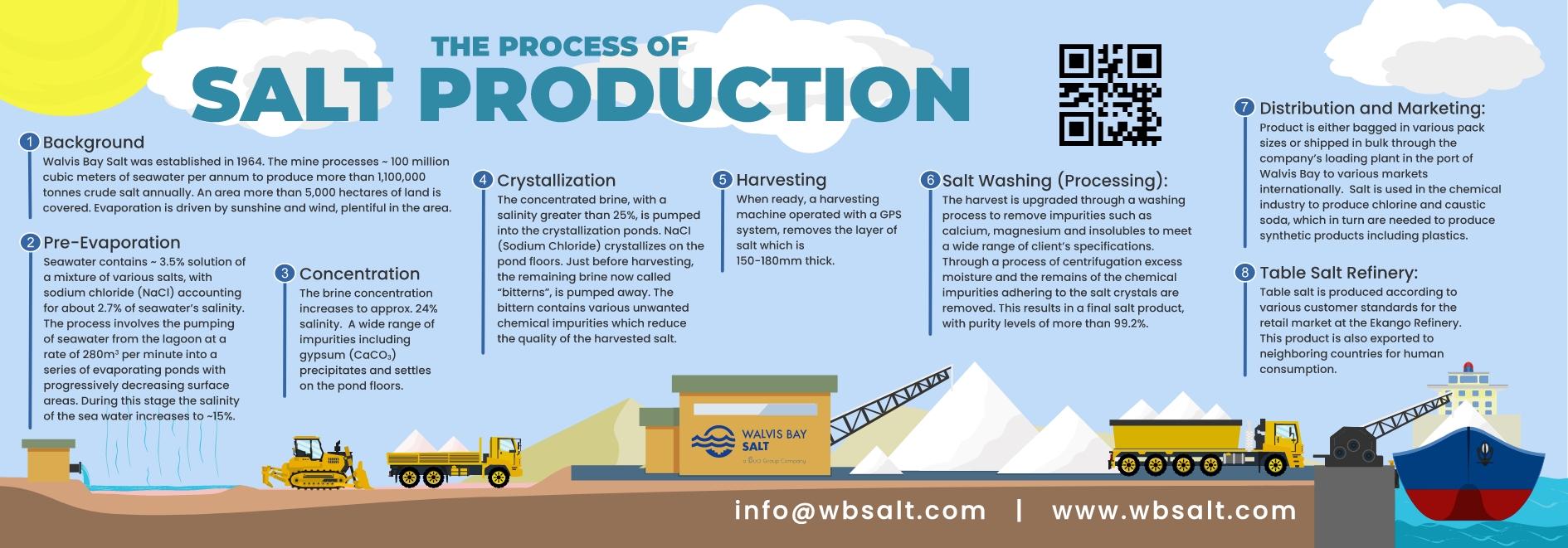 Salt & Chemicals operates the salt field and produces the raw salt, whilst Walvis Bay Salt Refiners further processes and markets the product internationally. Ekango Salt Refiners produces table salt for various local and international markets.